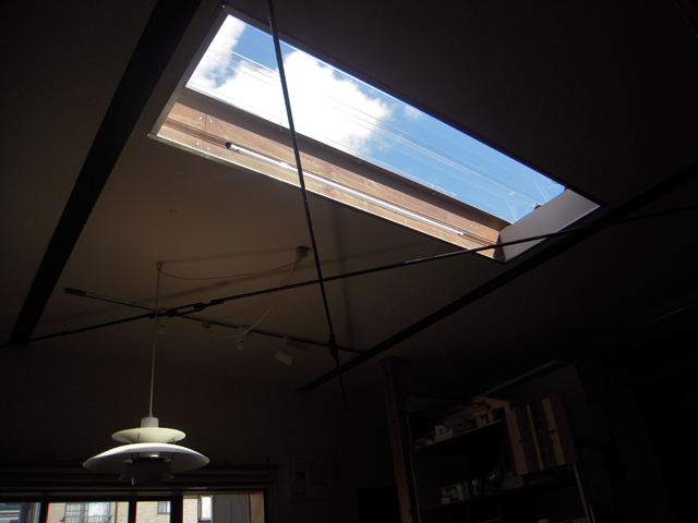 秋空 事務所の天窓。 暑かったり、寒かったり、色々と問題はあるが 室内から澄んだ秋の空、流れる雲が眺める事が できるのは、やはり心地よいものです。 夜は友人宅にて、秋の味覚である秋刀魚と芋煮、そして焼酎で乾杯。 外で飲むのが気持ちいい季節です。 投稿日:2010.10.11 |カテゴリ:ブログ, 日記 記事一覧を見る