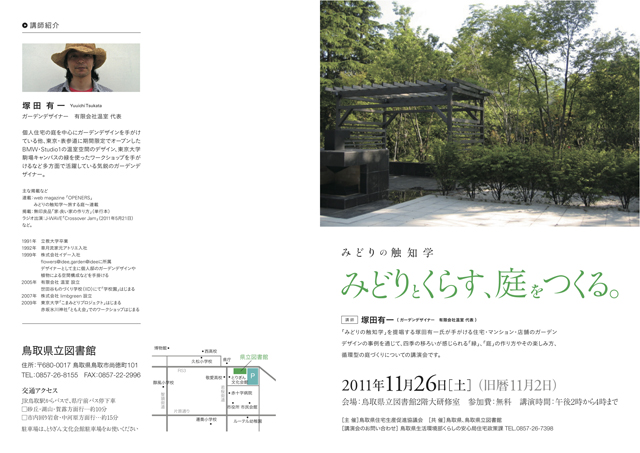 11.26 11月26日、土曜日、午後2時〜 ガーデンデザイナーの塚田有一さんの講演会が催されます。 緑の話、庭の話、花の話、色々と面白いお話が聞けそうです。 鳥取県立図書館2階大研修室にて。 入場無料。どなたでも参加できます。 興味のある人はぜひどうぞ。 投稿日:2011.10.27 |カテゴリ:イベント 記事一覧を見る