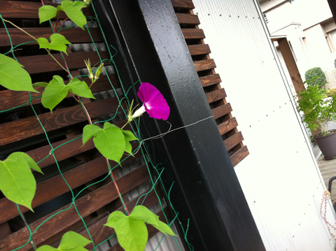 朝、事務所に着くと朝顔が一輪、咲いていて。