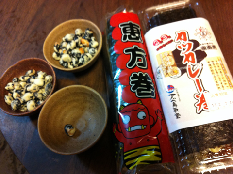節分 季節の分かれ目に邪気を払い、無病息災を願う。 歳の数だけ豆を食べる風習は子供の頃から。 いつの間にやら恵方巻きを食べるという習慣が当然のようになって、 今年も アベ鳥取堂さん の恵方巻きで願い事を思いながら、がぶり!と。 そして気がつけば豆の数が随分と多くなって。。 本日は立春。少し温かい一日でした。春までもう少しです。 投稿日:2013.02.04 |カテゴリ:ブログ, 日記 記事一覧を見る