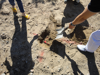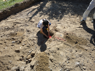 丁張りを終え、堀方の途中、「鎮め物」を地中に埋めます。